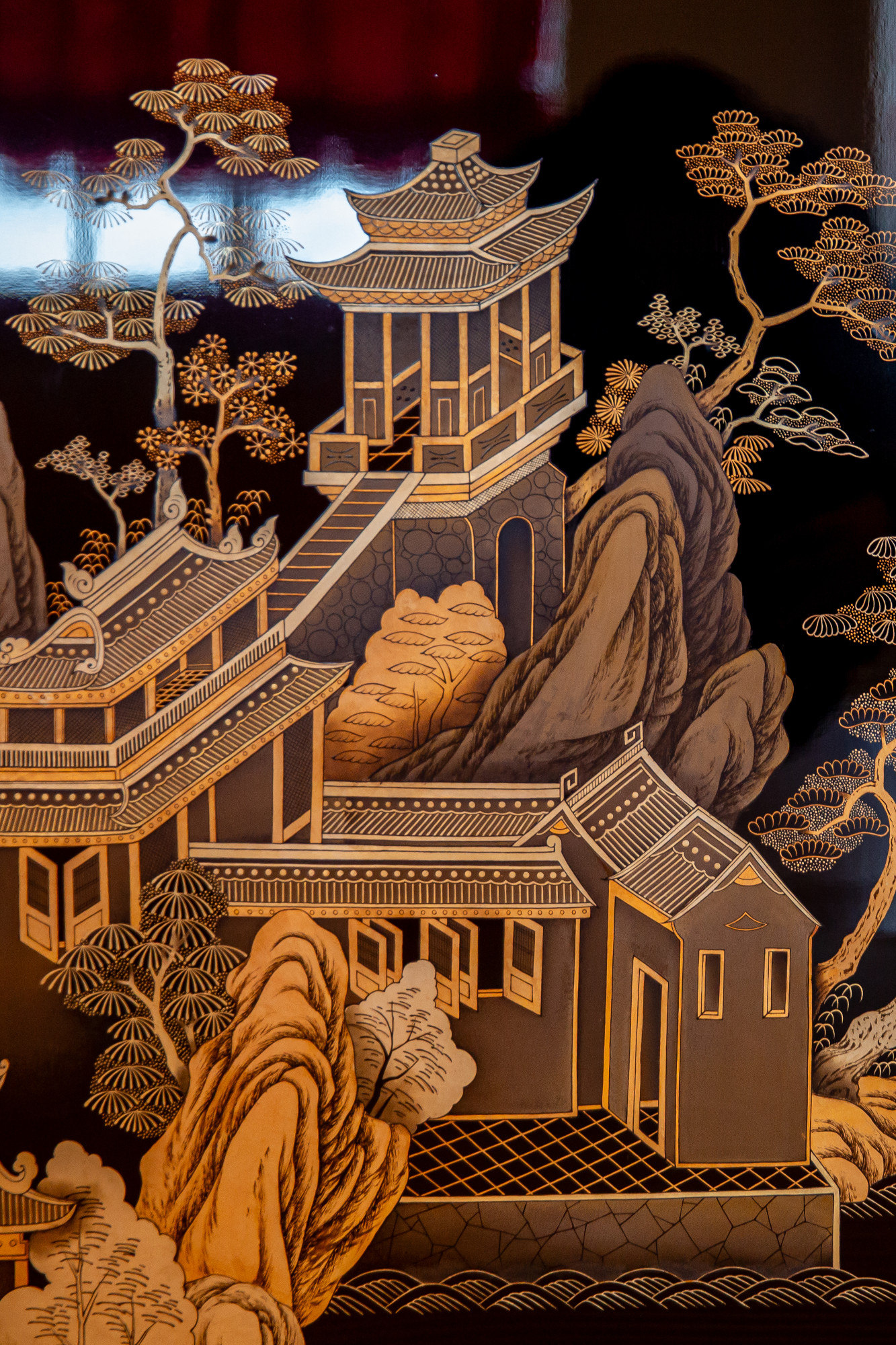 Образцами стали подлинные панно XVIII века из Китайского театра и аутентичная 12-створчатая ширма из Поднебесной, а также образцы из разных музеев. В итоге китайские мастера изготовили несколько видов лаковых панно в соответствии с проектом, разработанным архитекторами Царскосельской янтарной мастерской. Общая площадь их росписи – почти 170 квадратных метров. Готовые произведения на самолёте доставили из Пекина в Москву, а оттуда уже везли на грузовике, в сопровождении специализированного перевозчика музейных предметов.