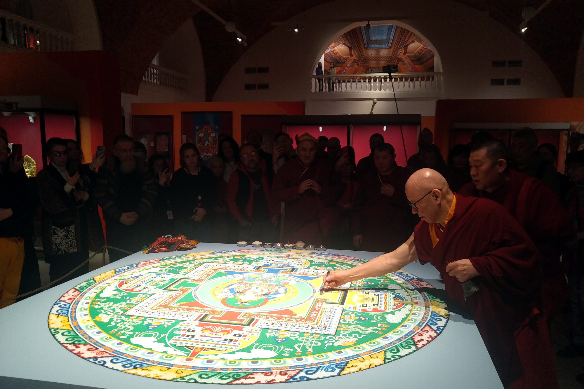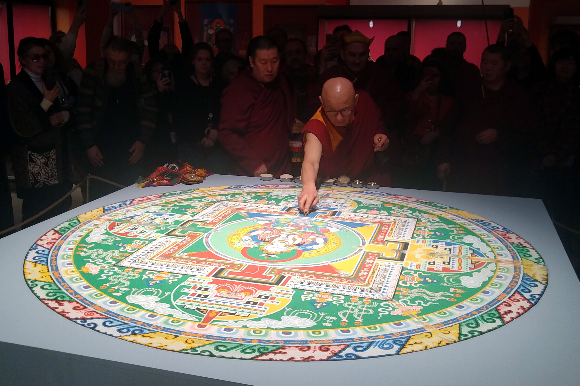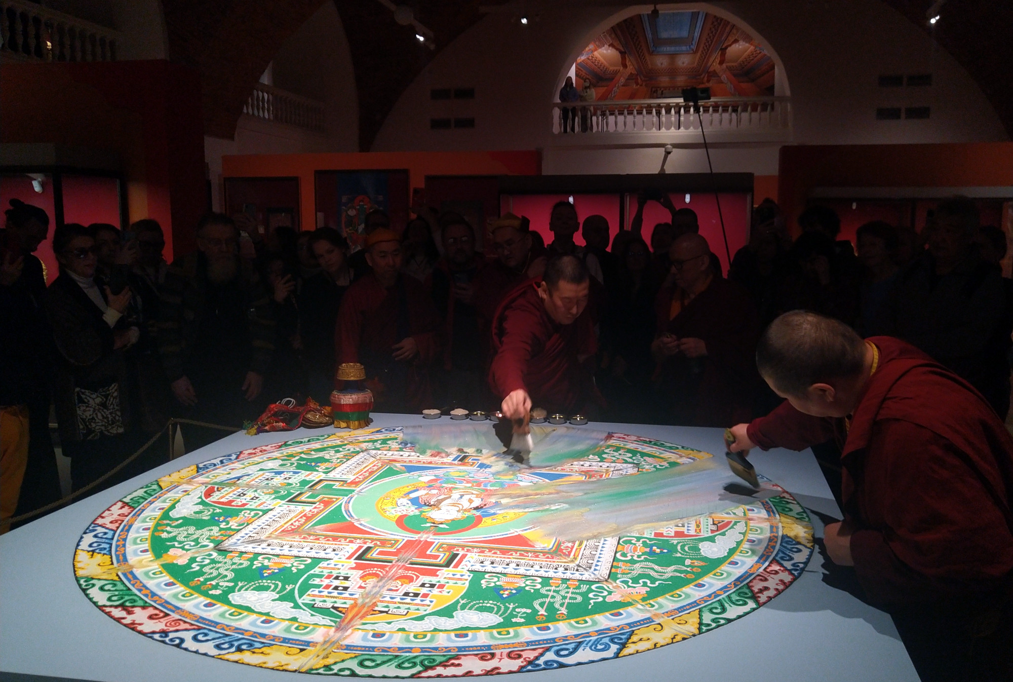 В четверг, 5 февраля, в манеже Малого Эрмитажа при большом стечении гостей была торжественно разрушена мандала, красовавшаяся в центре зала. Её создали перед открытием большой выставки искусства тибетского буддизма, названной «Драгоценность в лотосе», а уничтожение изображения означает, что и экспозиция скоро закроется.