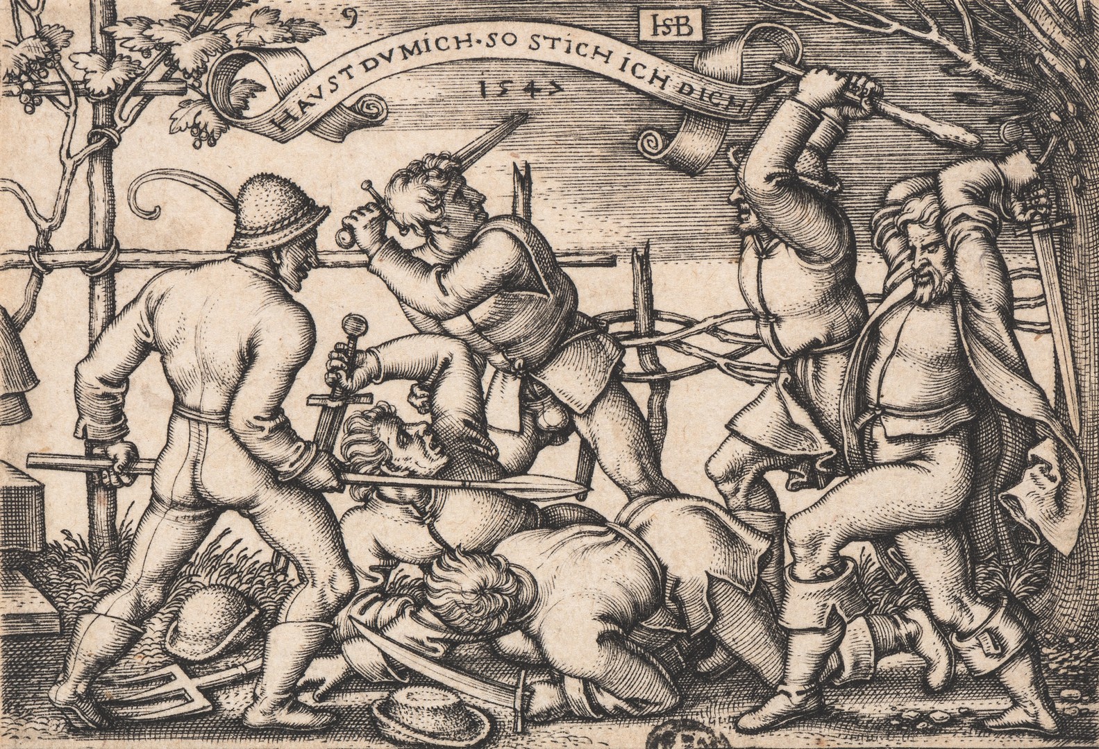Первый раздел выставки посвящен аллегориям, в которых молодые бунтари часто отталкивались от наследия Дюрера. Однако их гравюры наполнены гораздо более острым политическим подтекстом. Братья Бехамы и Георг Пенц вошли в историю как «три безбожных художника»: в январе 1525 года за радикальные протестантские взгляды и отрицание светских авторитетов они были заключены в тюрьму и изгнаны из Нюрнберга.